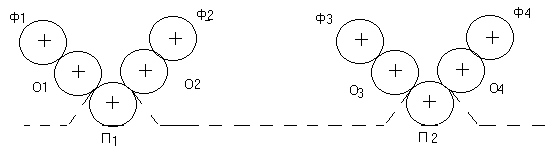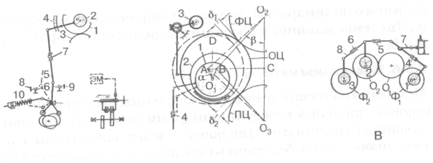 В офсетных машинах с четырехцилиндровыми печатными секциями давление регулируют в трех зонах: Ф1 ‑O1 , O1 –О2 , О2 –Ф2 (сх. в) поворотом втулок 1, 2, 3. В каждой зоне давление устанавливают индивидуально гайками 4, 5, 6 при неподвижном звене 7. Для того чтобы при регулировке давления в паре О1 –О2 гайкой 5 не нарушалось отрегулированное в зоне О2 –