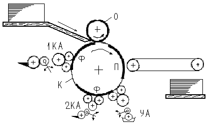 Самонаклад 1 подает листы по накладному столу 2 механизмом переднего и бокового равнения. Форгрейфер 3 подает выровненный лист в печатный аппарат, состоящий из трех цилиндров: печатного II, офсетного О и формного Ф. Механизм натиска позволяет включать и выключать давление в печатном аппарате путем перемещения офсетного цилиндра, опоры которого находятся в эксцентричных втулках. С помощью красочного аппарата К краска наносится на поверхность печатающих элементов.