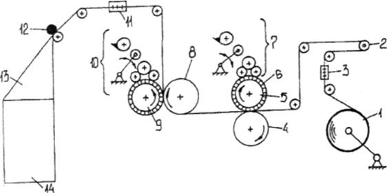 На рис.8. изображена схема рулонной ротационной машины высокой печати Лента разматывается с рулона 1, огибает направляющие валики и амортизационный валик 2, служащий для натяжения бумажного полотна. Для снятия частичек, пыли с бумаги применяется пылеотсасывающее устройство 3. Далее лента проходит через печатные секции: сначала между формным цилиндром 5, на котором закреплена печатная форма 6, и печатным цилиндром 4, запечатываясь с одной стороны. Краска на формный цилиндр наносится с помощью красочного аппарата 7. Затем, проходя между цилиндрами 8 и 9, лента запечатывается с оборота. Краска на формный машины высока, то цилиндр 9 поступает из красочного аппарата 10. Так как скорость возможно отматывание краски при запечатывании ленты. С целью закрепления краски на ленте используются сушильные устройства 11 (воздуходувные, газопламенные, высокочастотные). Отпечатанная лента поступает в фалъцевалъно-резальное устройство 14. На воронке 13 этого устройства запечатанная лента фальцуется в продольном направлении, затем, уже сложенная вдвое, разрезается в поперечном направлении и еще раз фальцуется. При необходимости лента может быть разрезана в продольном направлении дисковым ножом 12.