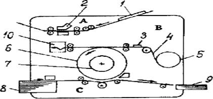 Использование современной цифровой электроники позволило фирме «РИЗО» (Японии) создать такие трафаретные машины, получившие название «ризографы», в которых процессы подготовки формы и печати объединены, что дает возможность получить первый оттиск через 20 секунд после установки оригинала. На рис.9. приведена схема ризографа. Копируемый оригинал 1помещается на встроенный сканер 2. Считываемая сканером информация преобразуется в цифровую форму и передается в устройство управления термоголовкой. Термоголовка 3 прожигает мельчайшие отверстия в многослойной мастер-пленке 4 в точном соответствии с оригиналом. Пленка автоматически сматывается с кассеты 5 и отрезается на необходимую длину.
