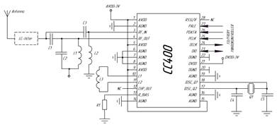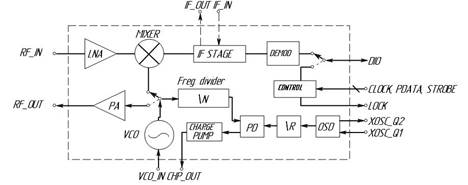 Наиболее простое решение построение беспроводного радиоканала, наверное, выглядит так: приемник, передатчик, модулятор, демодулятор, поместить все в один корпус – и все. Именно ток и поступил Chipcon, когда выпустил свои самые первые микросхемы СС400 и СС900. По сути, эти микросхемы абсолютно идентичны, единственное отличие микросхем – их рабочий диапазон: для СС400 – это диапазон 400 МГц, а для СС900 – 900 МГц. Блок схема СС400 приведена на (рис1). В режиме приема, микросхема работает как обычный гетеродинный приемник. Принимаемый на радиочастотном входе (RF_IN) сигнал, усиливается малошумящим усилителем (LNA), а затем мультиплексором переносится на промежуточную частоту. На этой частоте фильтруется, демодулируется и дальше выделяется полезный сигнал. В режиме передачи все еще проще: генератор, модулятор, выходной фильтр – и через антенну в эфир. Микросхемы СС400 и СС900 имеют следующие характеристики: