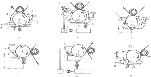 Известны три способа подачи жидкой краски на форму: 1) погружением нижней части формного цилиндра в красочное корыто; 2) накатным валиком, частично погруженным в краску; 3) принудительной циркуляционной системой. В простейших аппаратах, применяемых и поныне, в основном в тихоходных машинах, используется первый способ: нижняя часть формного цилиндра ФЦ (рис.1, а) погружена в красочное корыто 1. С пробельных участков цилиндра краску удаляет ракельный нож 2, плотно прилегающий к цилиндру по всей длине его образующей. Чтобы краска не разбрызгивалась, применяют щитки 3 и 4. При смене цилиндра и во время перерывов в работе корыто опускают. Такие аппараты применяют преимущественно в листовых ротационных машинах. Краску можно заливать в корыто вручную или подавать специальной системой.