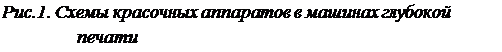 Красочные аппараты машин глубокой печати, предназначенных для печатания с пластинчатых форм, изготовляются по сх. е. Так как в этих машинах формный цилиндр имеет холостую часть поверхности, в выемке которой размещается устройство для затяжки формы, то во избежание удара о выступы цилиндра обрезиненный красочный валик и ракель периодически отводятся от последнего кулачковыми механизмами. Аппараты с одним погруженным в краску валиком, имеющим покрытую ворсистой тканью поверхность, используются иногда и в машинах, в которых формный цилиндр выемки не имеет. Ворс на валике мешает проникновению в растровые ячейки формы воздушных пузырьков, образующихся из-за вспенивания краски в быстроходных машинах, что вызывает «пятнистость» оттисков.
