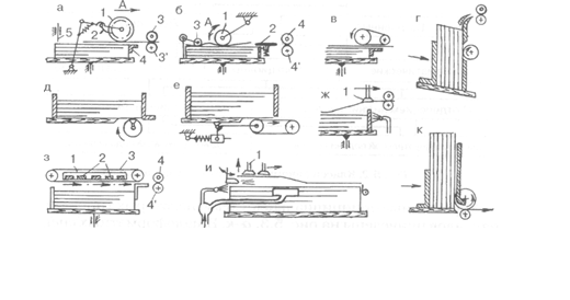 Классификационная схема самонакладов приведена на рис.3. Пo конфигурации стопы самонаклады делятся на плоскостапельные и круглостапельные, но поскольку вторые встречаются только в фальцевальных машинах, в классификации самонакладов печатных машин этот признак не учитывается. Существенными оказываются другие признаки: расположение стопы — горизонтальное или вертикальное, способ установки в машине — на общей станине или отдельно (выносные), принцип отделения листов, сторона стопы, с которой отделяется лист, — верхняя или нижняя, порядок Упрощенные принципиальные схемы некоторых типов самонакладов приведены на рис.3.1 а-к. В малоформатных специальных печатномножительных машинах для трафаретной, литоофсетной или электрографской печати и переносных машинах нестационарного типа, рассчитанных на невысокие скорости работы, как правило, используются фрикционные самонаклады, в которых верхние листы отделяются от стопы фрикционными роликами 1 (рис.3.1 а) или планками. В период рабочего хода по стрелке А ролики, удерживаемые собачкой 2 или обгонной муфтой, не вращаются и благодаря фрикционному сцеплению с верхним листом смещают его в подающую пару 3, 3'. При обратном ходе ролики свободно прокатываются по стопе. Для надежности отделения от стопы только одного листа служат передние ограничители 4 или иглы 5, удерживающие кромки последующих листов от сдвига во время подачи предыдущего листа.
