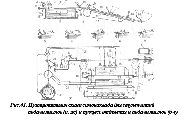 Самонаклады с отделением от стопы нижних листов (сх. д, е) или с отделением от вертикальной стопы передних листов (сх. г, к) вращающимися вакуумными (сх. д) или фрикционными (сх. г, к) валиками, ремнями или лентами (сх. е) из-за невысокой точности и малой надежности подачи листов применяются лишь в малоформатных машинах, предназначенных для печатания на конвертах, карточках, конторских бланках и т.п. Достоинство этих самонакладов в том, что они допускают безостановочную загрузку листами на ходу машины.