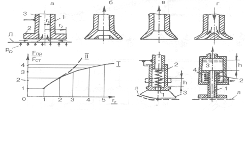 На сх. б показано, что при опускании задних (отделяющих) присосов с включенным в них вакуумом происходит всасывание в них воздуха, находящегося над поверхностью листа, под который сзади, а в некоторых самонакладах и с боков подаются струи сжатого воздуха. Пока лист не отделен от стопы полностью, они могут проникнуть под него лишь частично. От момента создания разрежения в присосах зависят зоны распределения пониженного давления над листом, возникающего согласно закону Бернулли, и зависит необходимый расход воздуха.