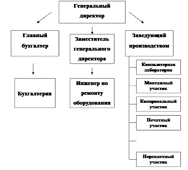 Компьютерная лаборатория, монтажный, копировальный, переплетный, резальный и печатный участки, которые находятся в ведении и под ответственностью заведующего производством и в подчинении генерального директора.