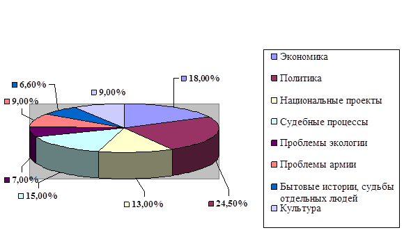 Как видно из представленных выше диаграмм, во втором полугодии в поле зрения газеты попадают все те же темы, что и в первом. Между тем происходит некоторое перераспределение степени информационного интереса издания к ним. Например, количество публикаций, посвященных экономике, возрастает на 6,5 %, количество публикаций, посвященных политике и культуре – на 2 %, бытовым историям – на 14, 4 %. В начале 2007 г. наблюдается всплеск публикаций, посвященных политической тематике, что, на наш взгляд, обусловлено стартовавшей на тот момент в крае предвыборной кампании.