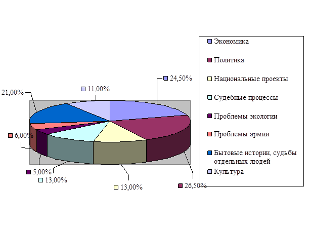 Незначительно изменилась по сравнению с первым полугодием 2006 г. представленность различных видов тематики на страницах газеты «Ставропольские губернские ведомости». Процентное соотношение различных тем, встречающихся в издании в первом полугодии 2006 г. и во втором полугодии 2006 – начале 2007 гг. представлено в Диаграмме 2 и Диаграмме 3 соответственно.