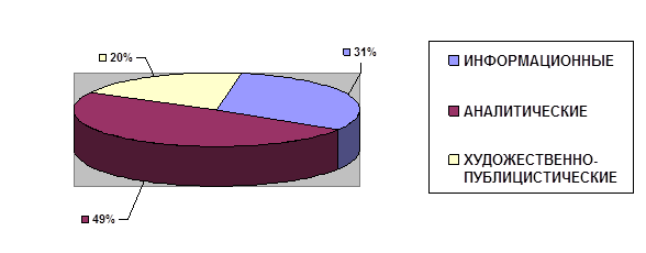 2 полугодие (периодичность – еженедельная): информационные – 31 %, аналитические – 49 %, художественно-публицистические – 20 %.