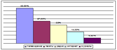 телевидение-43%(46 чел) радио-22,4%(24 чел) газеты-27%(29 чел) журналы-6,5%(7 чел) интернет-14%(15 чел) |