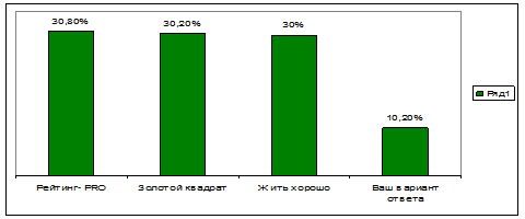 «Рейтинг-PRO»-30,8%(33 чел) «Золотой квадрат»-30,2%(32 чел) «Жить хорошо»-30%(31 чел) Ваш вариант отв.- 10,2%(11 чел) |