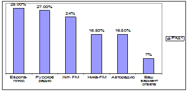 «Хит-FM»-46,6%(7 чел) «Европа-плюс»-33,3%(5 чел) «Русское радио»-40%(6 чел) «Ника-FM»-40%(6 чел) «Авторадио»-33,3%(5 чел) Ваш вариант отв.-20%(3 чел) |
