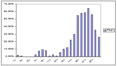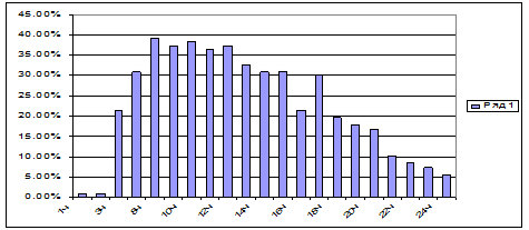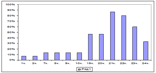 Седьмой вопрос: «В какое время Ваши клиенты предпочитают смотреть телевизор?», сотрудники выбрали следующие промежутки времени. Наиболее активно внешняя аудитория ООО «РУСИНТЕРФАРМ», по мнению внутренней аудитории ООО «РУСИНТЕРФАРМ» смотрит телевизор в промежутке с 19.00 до 24.00 смотрят 33,3% - 80% (5- 12 человек), пиком просмотра является временной отрезок 21.00 -80% (12 человек) (рис.24):