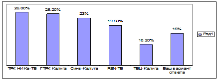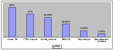 ГТРК «Калуга»-46,6%(7 чел) ТРК «Ника-ТВ»-60%(9 чел) Cинв-Калуга-40%(6 чел) ТВЦ-Калуга-13,3%(2 чел) REN-ТВ-26,6%(4 чел) |