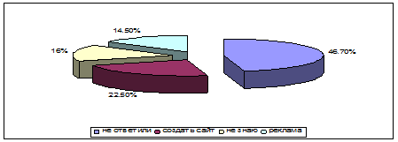 | По результатам исследования Интернетом пользуются- 58% (62 человека) опрошенных, и по их мнению следует создать сайт ООО «РУСИНТЕРФАРМ» 22,5% опрошенных (14 человек) и запустить рекламу в интернете посоветовали 14,5% опрошенных (9 человек). | По мнению сотрудников- 66,7% (10 человек) клиенты ООО «РУСИНТЕРФАРМ» пользуются сетью Интернет. |