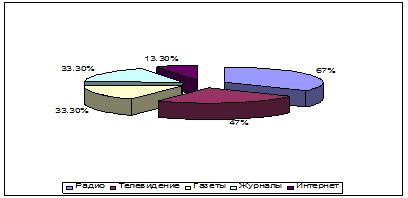 телевидение-46,6%(7чел) радио-66,6%(10чел) газеты-33,3%(5 чел) журналы-33,3%(5 чел) интернет-13,3%(2 чел) |