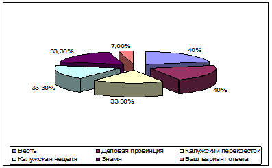 «Весть»-40%(6 чел) «Калужский перекресток»-33,3%(5 чел) «Калужская неделя»-33,3%(5 чел) «Знамя»-33,3%(5 чел) «Деловая провинция»-40%(6 чел) Ваш вариант отв.-7%()1 чел |