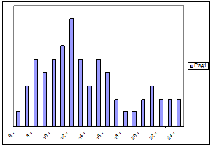 Пятый вопрос: «В какое время Ваши клиенты обычно слушают радио?» (рис. 22) Сотрудники ООО «РУСИНТЕРФАРМ» отмечали те часы, в которые по их мнению клиенты данной организации слушают радио. Промежуток времени с 1 часа до 5 утра ни кем не был отмечен. По мнению сотрудников ООО «РУСИНТЕРФАРМ», клиенты данной организации слушают радио с 7.00 до 17.00, это время отметили 20%- 53,3% опрошенных, наиболее высокий показатель активности это 13.00 в это время радио слушают 53,3% опрошенных (8 человек) (рис. 22):