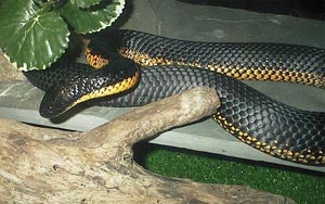 ЗМЕЯ ТИГРОВАЯ (Notechis scutatus) уступает по величине тайпану, достигая всего 1,5—2 м длины, но яд ее очень силен; считается, что у тигровой змеи наиболее сильный яд среди всех наземных змей. В Австралии, как известно, тигров нет, и к тиграм эта змея не может иметь никакого отношения. Опасность встречи с этой змеей усугубляется еще и тем, что она широко распространена почти по всему материку Австралия, кроме самых северных областей, и населяет также Тасманию и ряд островов у южного побережья. Черное туловище змеи перехвачено нерезкими сернисто-желтыми кольцами, а брюхо имеет желтую окраску. В возбужденном состоянии тигровая змея высоко поднимает переднюю часть туловища, сильно уплощая голову и шею. Укушенные тигровой змеей мелкие животные погибают моментально, буквально не сходя с места. Подсчитано, что яда, содержащегося в железах крупной тигровой змеи, достаточно, чтобы убить 400 человек. Яйцеживородяща и приносит обильное потомство — обычно до 72 змеенышей. (Известен случай, когда у крупной самки нашли при вскрытии 109 зародышей.)