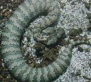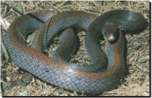 ЗМЕЯ СМЕРТЕЛЬНАЯ (Acanthophis antarcticus) примечательна большим внешним сходством с гадюками. Ее широкая голова с выступающими скулами имеет треугольную форму с резким шейным перехватом, надглазничный щиток резко выступает вбок, чешуи на верхней стороне туловища снабжены ребрышками. Тело ее короткое и кургузое, и ведет себя она также подобно гадюке. При появлении опасности змея лежит неподвижно, не спасаясь бегством и не принимая отпугивающей позы, а полагается на свою покровительственную окраску, делающую ее незаметной. В связи с такой манерой поведения путник чаще сталкивается вплотную со змеей и бывает укушен ею. Яд смертельной змеи втрое слабее, чем тигровой змеи, и по размерам она заметно мельче. Но все-таки половина укушенных этой змеей людей погибает. Широкое распространение (Австралия, Новая Гвинея и соседние острова) усугубляет приносимый ею вред.