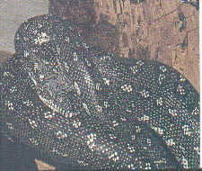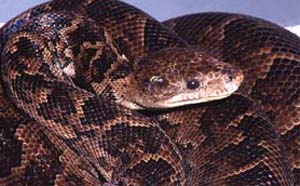 ПИТОН РОМБИЧЕСКИЙ (Morelia argus) до недавнего времени считался членом другого рода и назывался Python spilotes. Окраска ромбического питона яркая и изменчивая, состоит из основного голубовато-черного фона, по которому разбросаны ярко-желтые ромбические пятна. Хорошо выделяется особая цветовая вариация ромбического питона, называемая ковровой змеей (М. a. var. variegata) и слегка похожая по рисунку туловища на иероглифового питона. Ромбический питон распространен в Австралии и на Новой Гвинее, причем вполне обычен в сырых равнинных местах, чаще близ воды, особенно в сухие периоды года. Длинный и цепкий хвост помогает змее очень ловко лазать по деревьям. Кормится он мелкими сумчатыми, грызунами и птицами, а крупные (около 3 м) змеи охотятся на многочисленных в Австралии кроликов. В амбарах и на складах уничтожает мышей и крыс. При содержании в неволе эти красивые змеи быстро привыкают и хорошо едят, но живут в неволе 1—2, максимум 4 года.