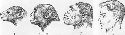 Изменение формы головы животного и человека в процессе эволюции . Виден постепенный переход от выраженной прогнатии к ортогнатии переднего отдела головы: 1 – полуобезьяна, 2 – антропоид, 3 – австралопитек, 4 – современный человек