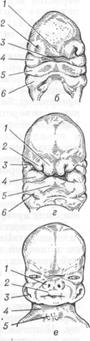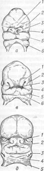 2 — латеральный носовой отросток, 3 — слезно-носовая борозда, 4 — верхне челюстной отросток, 5 — нижняя челюсть, 6— гиомандибулярная щель); д — эмб рион 7 недель (1 — латеральный носовой отросток, 2—медиальный носовой отросток, 3 — слуховые бугорки вокруг гиомандибулярной щели, 4 — подъязычная кость,5 — хрящи гортани); е — эмбрион 7 с половиной недель (1 —латеральный носовой отросток, 2 — сросшиеся медиальные носовые отростки — фильтр губы, 3 — наружное ухо, 4 — подъязычная кость, 5 — хрящи гортани).