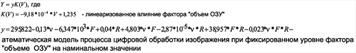 При проведении обработки экспериментальных данных раздельных экспериментов был сделан вывод, что существенное нелинейное влияние на математическую модель, полученную по результатам первой серии опытов, оказывал фактор «объем ОЗУ». В дальнейшем он был линеаризован с точностью до 3%, и получена окончательная математическая модель процесса обработки изображения, которая удовлетворяет критериям адекватности и может быть использована для планирования временных затрат на этапе допечатной подготовки изданий. Она имеет вид, представленный в формуле (1):