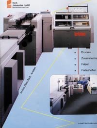 Таким образом, может быть выполнена полистная печать книги на системе Xerox DocuTech, а затем в линию можно осуществить всю послепечатную обработку различными способами, вплоть до выпуска полностью готовых книг. В частности, фирма Bourg имеет различные опции послепечатной обработки — от стапелирования до изготовления брошюр шитьем внакидку или втачку либо посредством бесшвейного скрепления клеем и подрезки с трех сторон.