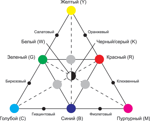 в центре треугольников — белый, если цвета созданы источником излучения — Y+M+C или R+G+B; черный, если это цвета красок Y+M+C или R+G+B, хотя достаточно двух красок разных цветов из малого треугольника, чтобы получить черный (серый), — R+B, G+B или R+G;