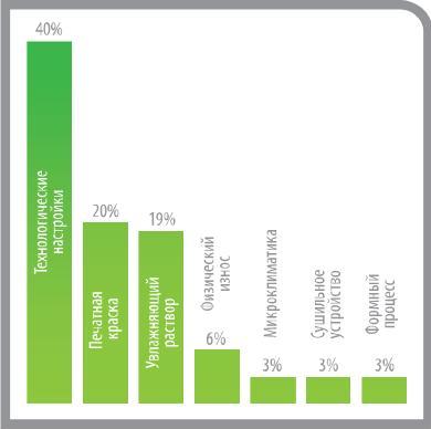 Что касается всего остального, то на физический износ конструктивных элементов печатной машины приходится около 6%, на низкокачественные формные процессы, несоответствующую микроклиматику и проблемы с сушильным устройством – по 3% соответственно.