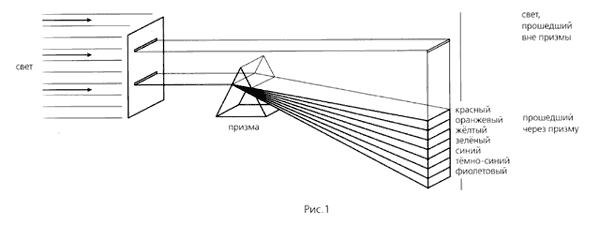 Солнечный свет пропускался через узкую щель и падал на призму. В призме луч белого цвета расслаивался на отдельные спектральные цвета. Разложенный таким образом он направлялся затем на экран, где возникало изображение спектра. Непрерывная цветная лента начиналась с красного цвета и через оранжевый, жёлтый, зеленый, синий кончалась фиолетовым. Если это изображение затем пропускалось через собирающую линзу, то соединение всех цветов вновь давало белый цвет. Эти цвета получаются из солнечного луча с помощью преломления. Существуют и другие физические пути образования, например, связанные с процессами интерференции, дифракции, поляризации и флуоресценции.