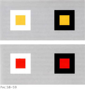 На рисунке 58 жёлтый квадрат дан на белом и на чёрном фоне. На белом фоне он кажется темнее, производя впечатление лёгкого нежного тепла. На чёрном же становится чрезвычайно светлым и приобретает холодный, агрессивный характер.