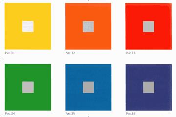 Понятие цветовой гармонии должно быть изъято из области субъективных чувств и перенесено в область объективных закономерностей. Гармония — это равновесие, симметрия сил. Изучение физиологической стороны цветового видения приближает нас к решению этой проблемы. Так, если некоторое время смотреть на зелёный квадрат, а потом закрыть глаза, то в глазах у нас возникнет красный квадрат. И наоборот, наблюдая красный квадрат, мы получим его "обратку" — зелёный. Эти опыты можно производить со всеми цветами, и они подтверждают, что цветовой образ, возникающий в глазах, всегда основан на цвете, дополнительном к реально увиденному. Глаза требуют или порождают комплиментарные цвета. И это есть естественная потребность достичь равновесия. Это явление можно назвать последовательным контрастом. Другой опыт состоит в том, что на цветной квадрат мы накладываем серый квадрат меньшего размера, но той же яркости. На жёлтом этот серый квадрат покажется нам светло-фиолетовым, на оранжевом — голубовато-серым, на красном — зеленовато-серым, на зелёном — красновато-серым, на синем — оранжево-серым и на фиолетовом — желтовато-серым (рис. 31-36). Каждый цвет заставляет серый принять его дополнительный оттенок. Чистые цвета также имеют тенденцию окрашивать другие хроматические цвета в свой дополнительный цвет. Это явление называется симультанным контрастом.
