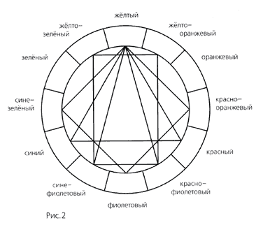 Связь всех этих фигур в двенадцатичастном цветовом круге иллюстрирует рисунок 2. Жёлто-красно-синий образуют здесь основное гармоничное трезвучие. Если эти цвета в системе двенадцатичастного цветового круга соединить между собой, то мы получим равносторонний треугольник. В этом трезвучии каждый цвет представлен с предельной силой и интенсивностью, причём каждый из них выступает здесь в своих типично родовых качествах, то есть жёлтый действует на зрителя как жёлтый, красный — как красный и синий — как синий. Глаз не требует добавочных дополнительных цветов, а их смесь даёт тёмный черно-серый цвет. Жёлтый, красно-фиолетовый и сине-фиолетовый цвета объединяет фигура равнобедренного треугольника. Гармоничное созвучие жёлтого, красно-оранжевого, фиолетового и сине-зелёного объединены квадратом. Прямоугольник же даёт сгармонизованное сочетание жёлто-оранжевого, красно-фиолетового, сине-фиоле-тового и жёлто-зелёного.