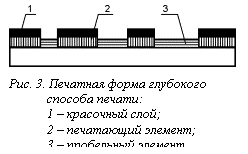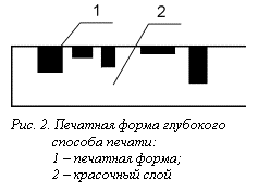 Данный способ печати предполагает использование высокоскоростных ротационных машин (60–80 тыс. цикл/ч и более). Печатная форма представляет из себя цилиндр с углубленными печатными элементами, и возвышающимися пробельными (рис. 2).