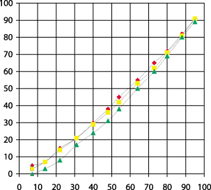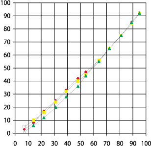 Анализируя градационные кривые при воспроизведении изображения с различной линиатурой, можно отметить, что при увеличении времени экспонирования наблюдаются 1-2% искажения в светах, но во всем остальном диапазоне градаций градационные кривые близки к идеальным. Такие результаты характеризуют пластины Futura Oro как материалы, которые пригодны для воспроизведения оригиналов различного типа с различной линиатурой.