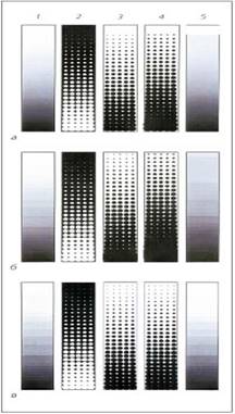 Для оценки градационной передачи пластин при копировании на печатную форму изображения с различной линиатурой использовалась шкала KALLE. При соблюдении всех технологических режимов и использовании шкал оперативного контроля должны получаться качественные печатные формы. На качественной печатной форме: