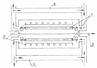Воздух поступает в сушильную камеру, состоящую из верхней и нижней половинок, проходит мимо раскаленных ИК-ламп (1), нагревается и направляется сверху и снизу вдоль бумажного полотна (2). Горячий воздух подается против направления движения полотна. Для создания мощных потоков воздуха используются два центробежных вентилятора, подающих воздух симметрично относительно продольной оси бумажного полотна. Над/под лампами располагается набор отражателей (3), которые возвращают на бумажное полотно часть энергии, генерируемой поверхностью ламп. Следует отметить, что в СУ могут использоваться лампы с нанесенным на них специальным отражающим покрытием, которое еще больше повышает эффективность работы СУ. Конечно, в качестве источников тепла могут использоваться не только лампы, но и нагревательные элементы других типов (например, ТЭНы, спирали и т.д.), но их инерционность при изменении режимов работы намного больше.