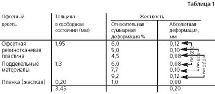 Первая часть этой деформации, которая восстановилась за 5-10 секунд после снятия нагрузки, принимается за упругую. Вторая часть деформации, которая восстанавливается со временем (15 мин.), характеризует эластические деформации пластины или декеля. И третья составляющая деформации сжатия, которая не восстановилась после снятия нагрузки, является остаточной деформацией пластины или декеля.