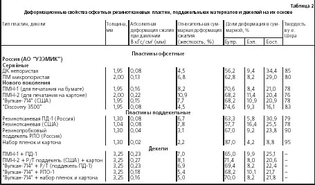 2-ая группа показателей характеризует деформационные свойства офсетных резинотканевых пластин и поддекельных материалов. Эти свойства практически не освоены специалистами: их показатели не учитываются не только при закупке пластин, но и при подборе офсетного декеля на печатных машинах, что значительно снижает качество печатной продукции, тиражестойкость дорогостоящего офсетного декеля и срок продуктивной работы печатных машин.
