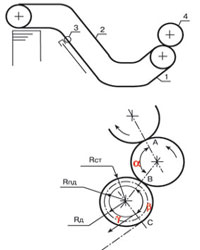 Известно, что из-за давления в зоне печати и при наличии достаточно вязкой, липкой краски лист бумаги прилипает к офсетному полотну. Поскольку передняя кромка листа удерживается захватами с определенным усилием, лист «отдирается» от офсетного полотна и движется в натянутом состоянии, пока задняя кромка листа (его «хвост») не выйдет из зоны печати. Так как лист опирается на поверхность печатного цилиндра, линейная скорость каждой его части на этом участке Vлa равна скорости стоек захватов печатного цилиндра —Vпц. Это справедливо на угле a — от зоны печати (точка А) до зоны передачи листа в захваты каретки листовыводного транспортера (точка В) — рис. 1.