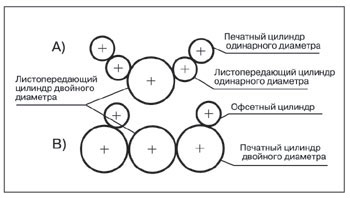 система из трех цилиндров (рис. 8а) — двух одинарного диаметра (по отношению к диаметру формного и офсетного цилиндров) и одного — двойного. Используется, как правило, при одинарном диаметре печатных цилиндров или при необходимости переворачивания листов для запечатывания оборотной стороны;
