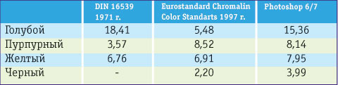 О возникновении понятия "евростандарт" читайте в авт. справке . Из нее мы узнаем, что первые упоминания о нем связывают его исключительно с цветом красок. При этом, единственным документом, который может называться "евростандарт", является не действующий сегодня DIN 16539. Что под этим термином подразумевают все те, кто продолжает эксплуатировать его, неизвестно. Видимо, каждый вкладывает в него свой, одному ему понятный смысл. Подтверждением сказанному являются данные таблицы на с. 14, в которой приведены значения трех источников, так или иначе претендующих на звание "евростандарт". В связи с тем, что CIELAB-координаты трехмерны и сложны для сравнительного анализа, абсолютные значения не приводятся. Для удобства воспользуемся относительными величинами, а именно цветовыми отличиями DЕab между цветами каждого из источников и значениями цветов триады согласно ISO 12647-2, о котором речь пойдет ниже.