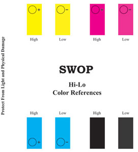 В связи с этим SWOP предлагает использовать эталоннyю шкалу со значениями плотностей (SWOP Hi-Lo Color Reference), которая распространяется отдельно от самого стандарта. Этот эталон цвета представляет собой восемь плашек, соответственно по две на каждый цвет CMYK: минимальная и максимальная интенсивность каждого цвета. Таким образом, одновременно задается как сам цвет, так и возможный интервал его изменения. Денситометр рекомендуется использовать для сравнительной оценки тиражного оттиска и этой шкалы в случае, если по каким-то причинам человеческий глаз подводит.