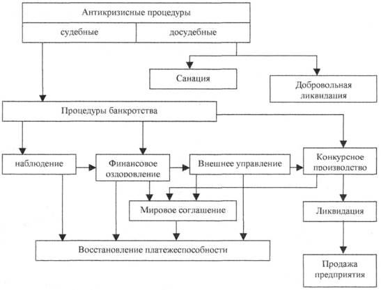 Банкротство . Это внешнее воздействие на должника с целью соразмерного удовлетворения требований кредиторов и изъятие хозяйствующего субъекта из экономической жизни. На данном этапе развития кризисных процессов на предприятии задачу восстановления платежеспособности решить уже невозможно. По сути, речь идет о выполнении установленной законом процедуры продажи имущества должника и распределении вырученных средств среди кредиторов.