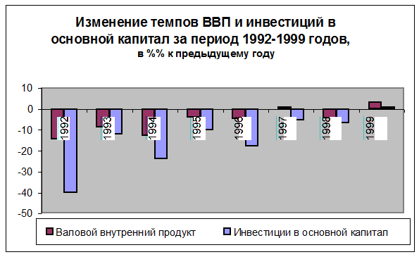 Экономическое развитие России за годы реформ характеризуется беспрецедентным падением объемов производства и еще в большей степени замораживанием инвестиционной активности. Валовой внутренний продукт ежегодно сокращался. Динамика 1998, 1999 годов соответствовала этим же тенденциям. Казалось бы, 1997 г. можно было считать переломным: рост ВВП в целом за год – 0.4%. Однако следующие три обстоятельства не позволяют сделать такого вывода {12, с. 91}. Во-первых, намечавшийся незначительный подъем происходит после столь значительного падения, что буквально утонул в обвальном снижении производства. Если сопоставть это снижение с падением объемов производства за годы Великой Отечественной войны (27%), то станет понятна глубина экономического спада, переживаемого Россией. Во-вторых, статистические данные о подъеме на 0.4 % лежат на уровне погрешности статистического учета стоимостного объема производства в сопоставимых ценах. В-третьих, подлинный и устойчивый рост всегда начинается с активизацией инвестиций в реальную экономику. Но этого не произошло ни в 1997 г., ни в 1999 г., проблема инвестиций еще более обострилась.