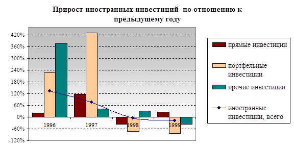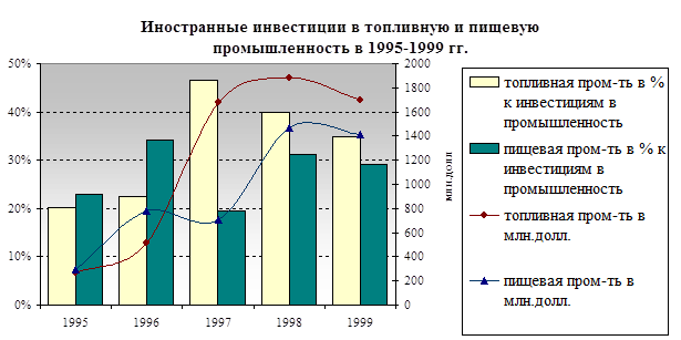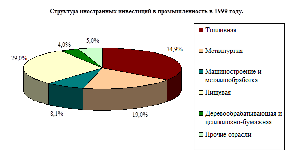 Изменение структуры инвестиций в сферу производства в 1999 году произошло за счет переориентации инвесторов с рынка капиталов на инвестиции в экспортные отрасли России и, прежде всего, в топливную промышленность, а также существенного увеличения вложений в пищевую промышленность. Так, на топливную и пищевую промышленность в 1999 году пришлось 82,7% объема иностранных вложений от прямых инвесторов, направляемых в промышленность.