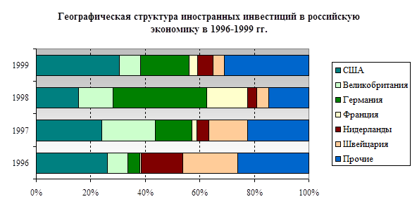 Страновая структура иностранных инвестиций в 1999 году характеризуется снижением уровня концентрации при сохранении лидирующей роли фирм США и сокращении поступлений из Германии. Вслед за США и Германией с долей вдвое меньше следует Великобритания, за ней: Нидерланды, Швейцария и Франция.